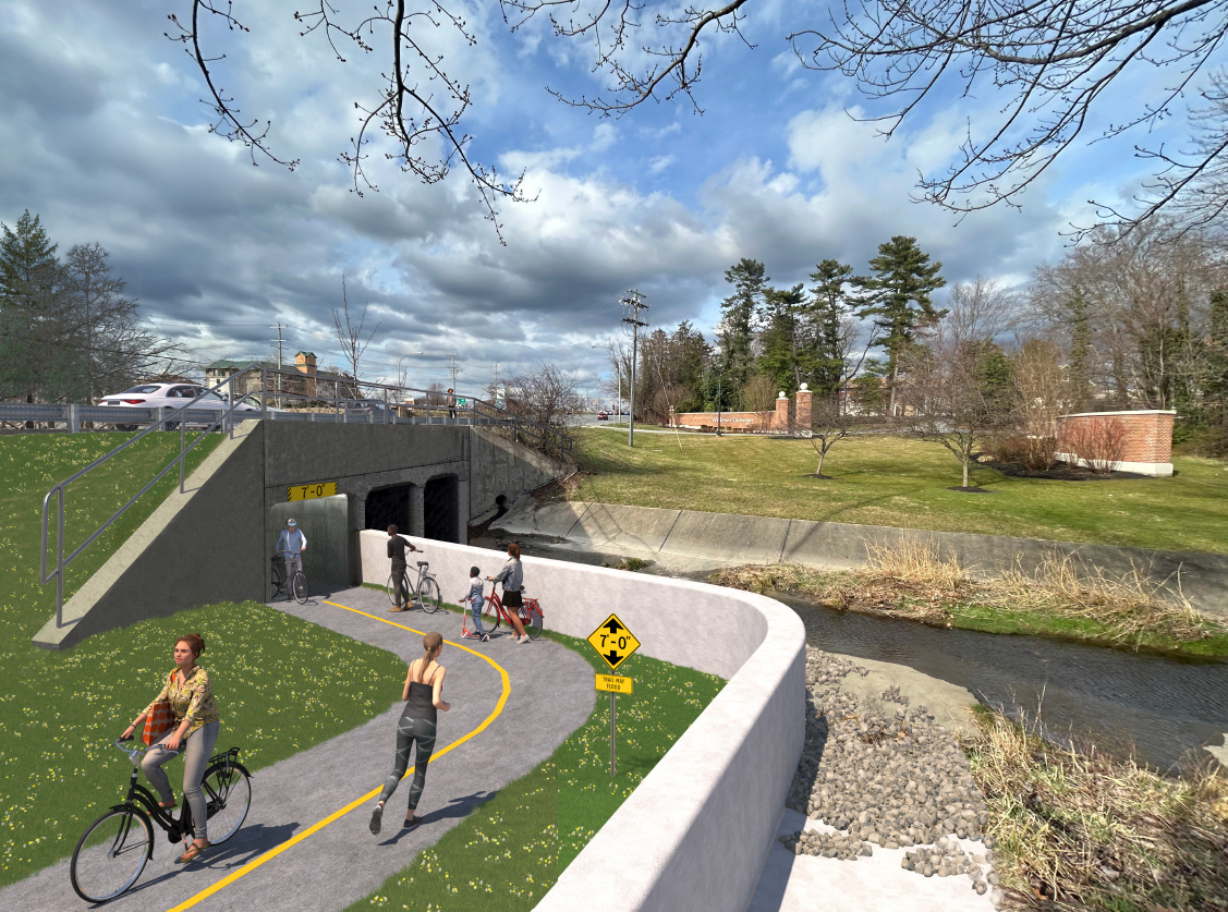 - Repurpose of the south cell of the culvert for the pedestrian and bicycle underpass, with a flood wall