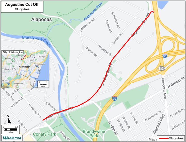 The Wilmington Area Planning Council (WILMAPCO), along with the Delaware Department of Transportation (DelDOT) and the New Castle County Department of Land Use, are working together to create a program of improvements for Augustine Cut Off. The Augustine Cut Off Multimodal Improvement Study, Phase 2, follows the Phase 1 study conducted by DelDOT in 2022 which led to a pathway/sidewalk improvement concept for Augustine Cut Off from Lovering Avenue to Cantera Avenue, which is currently in the design process.